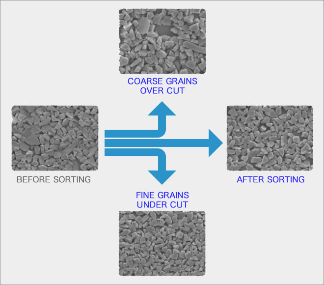 Our own sorting process removes both / either coarse size grains which tend to damage processed surface and fine size grains which tend to cluster from the original micron size diamond grain distribution.
